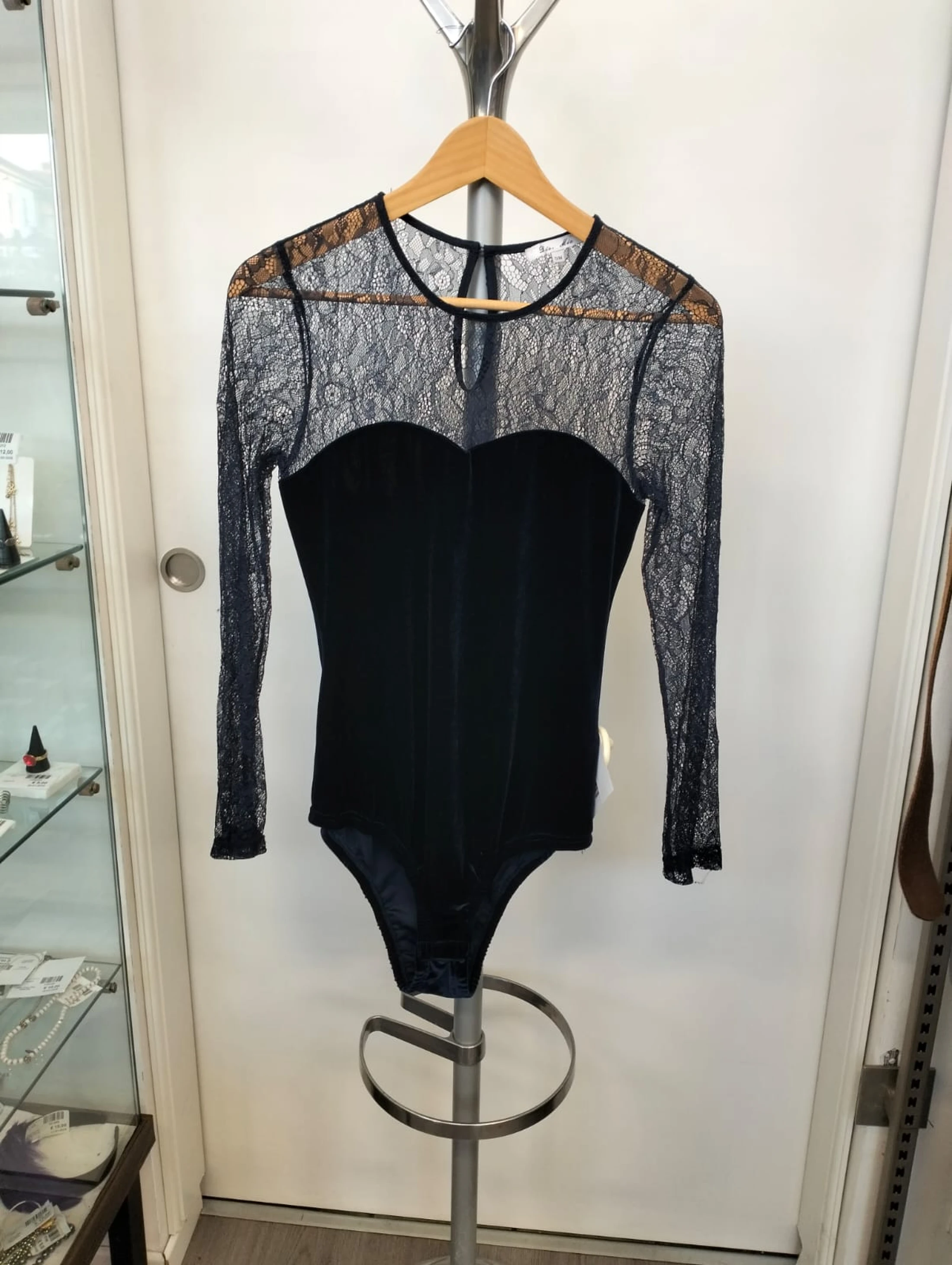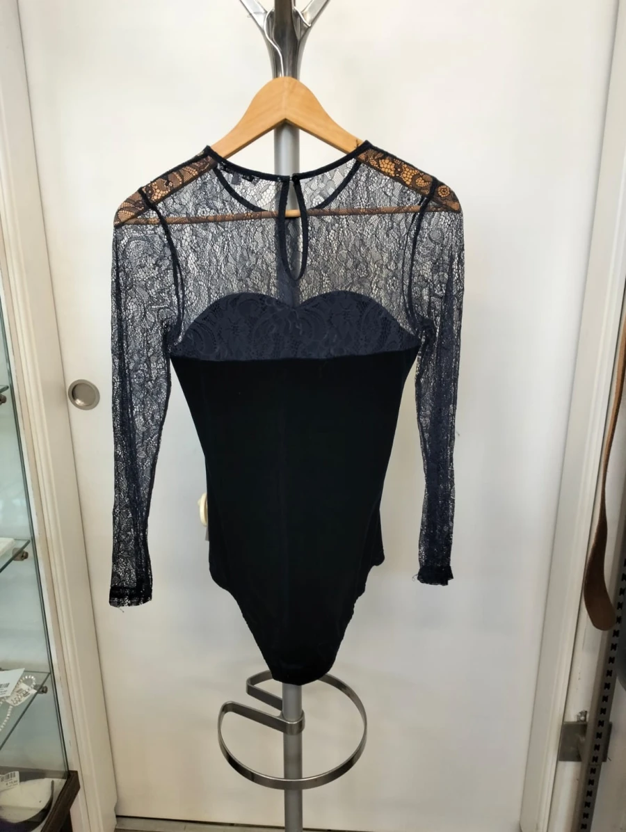 Body in velluto blu con maniche in pizzo
