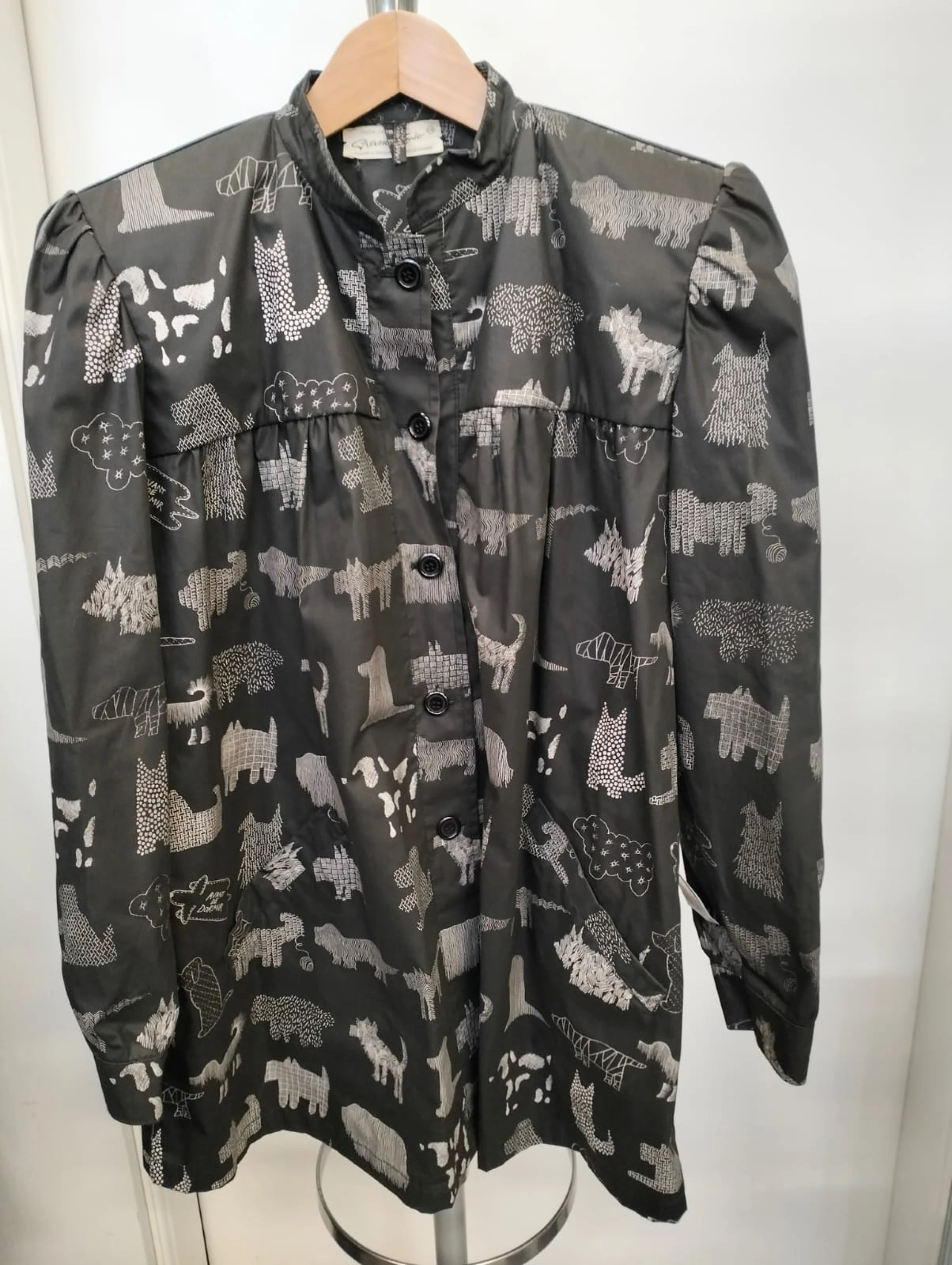 Impermeabile vintage con fantasia terrier e spalline a sbuffo